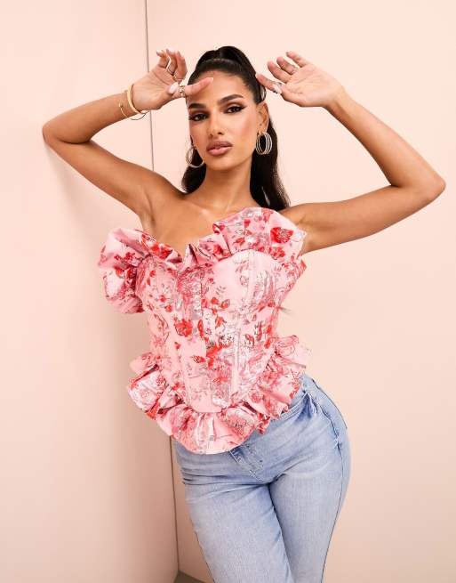 ASOS LUXE – Rosa och röd, blommig korsett-topp med volanger och bandeau-ringning i jacquardväv