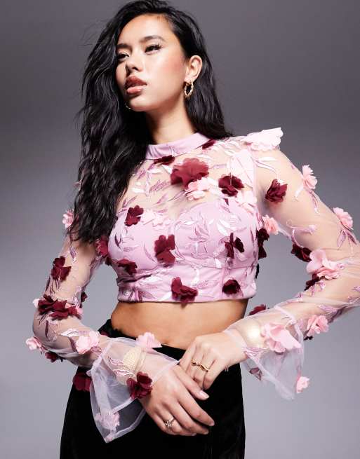 ASOS LUXE – Rosa och röd topp i organza med blommor i 3D