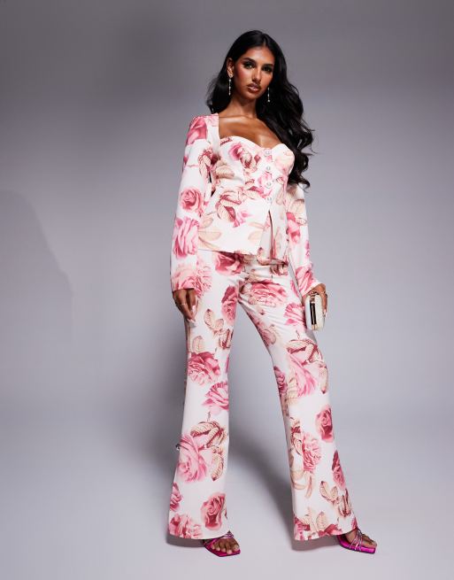 ASOS LUXE – Rosmönstrat, figursytt set med byxor och kavaj med hjärtformad ringning och rosett baktill