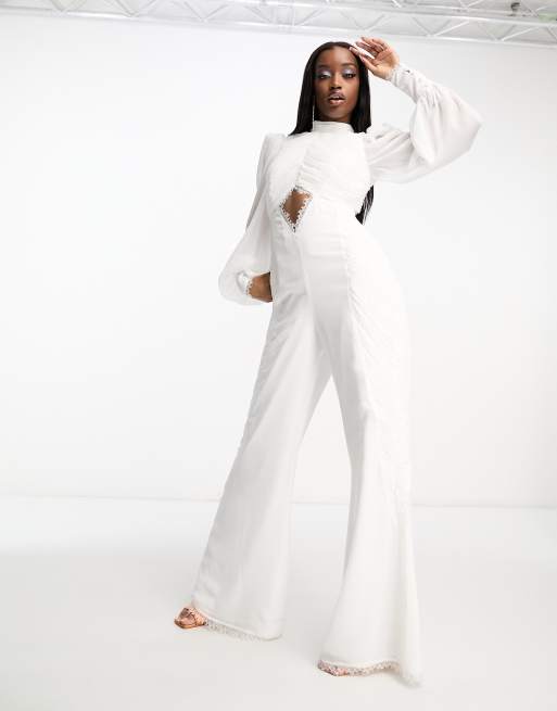ASOS LUXE – Vit, rynkad jumpsuit i chiffong med blusärmar och spetsdetaljer
