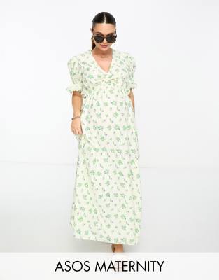 ASOS DESIGN Maternity – Krämvit, grönblommig smockklänning i midilängd av bomull