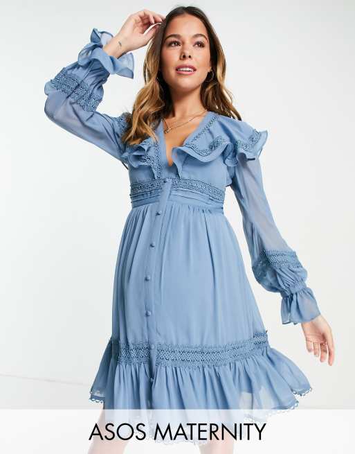 ASOS DESIGN Maternity – Miniklänning med spetsinfällningar, volanger och knäppning
