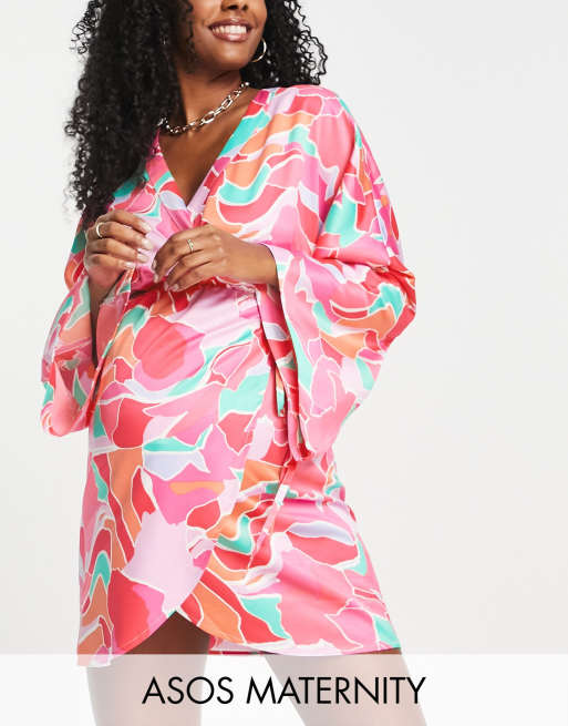 ASOS DESIGN Maternity – Rosa strandkimono i satin och färgglatt, abstrakt mönster med omlottdesign