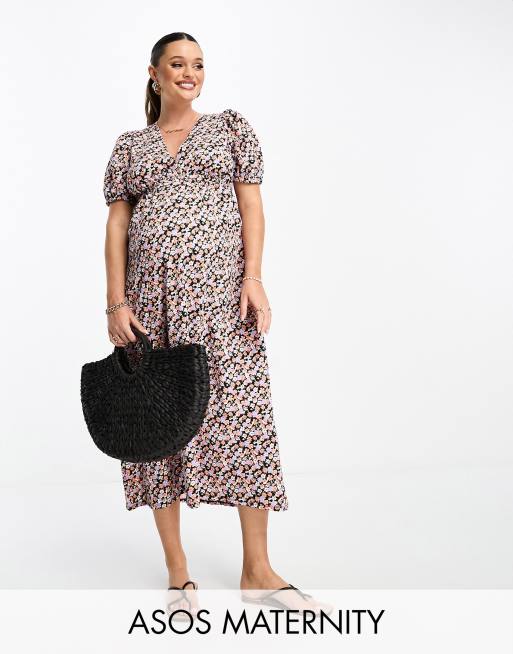 ASOS DESIGN Maternity – Småmönstrad klänning i midilängd med smockad midja och volymärm