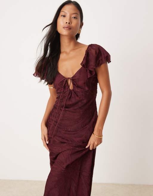 ASOS DESIGN Petite – Auberginefärgad maxiklänning i devoré med utsvängd ärm