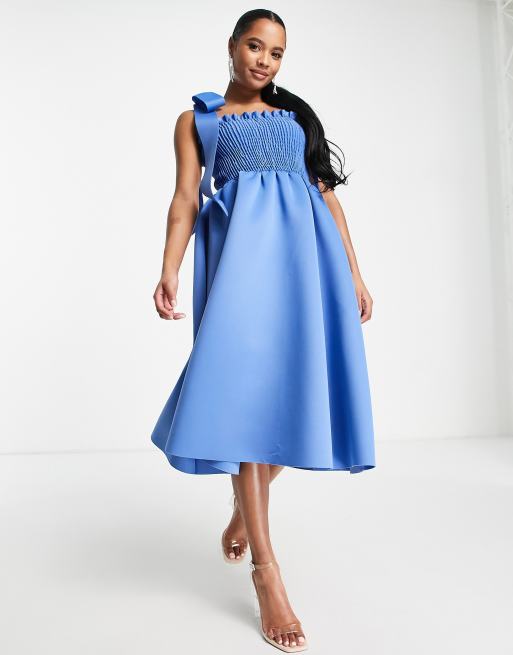 ASOS DESIGN Petite – Blå smockad midiklänning i balmodell med knutna rosetter