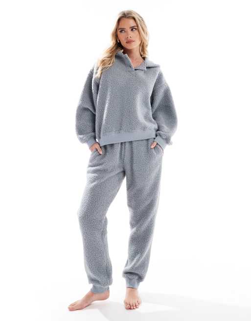 ASOS DESIGN Petite – Blått mysset i teddy med oversize-hoodie och joggingbyxor