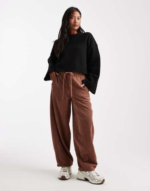 ASOS DESIGN Petite – Chokladbruna manchesterbyxor i dra på-modell med barrelben