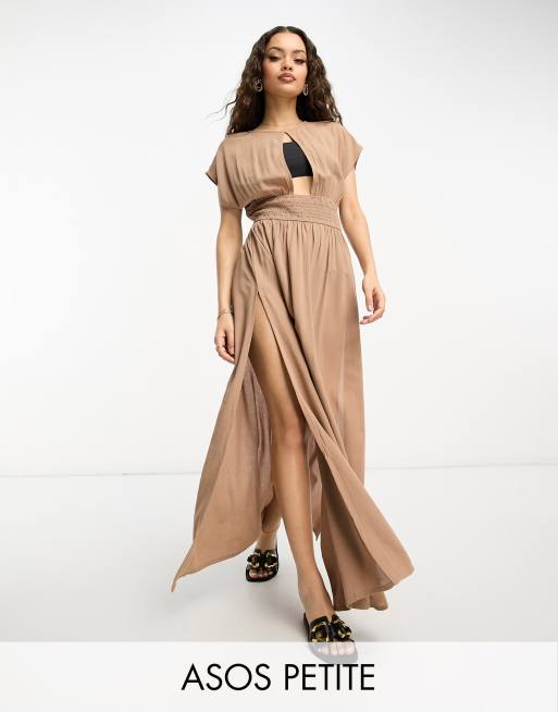 ASOS DESIGN Petite – Mockabrun, krinklad strandklänning i maxilängd med nyckelhålsöppning