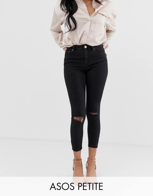 ASOS DESIGN Petite – Ridley – Svarta skinny jeans med hög midja och slitna knän