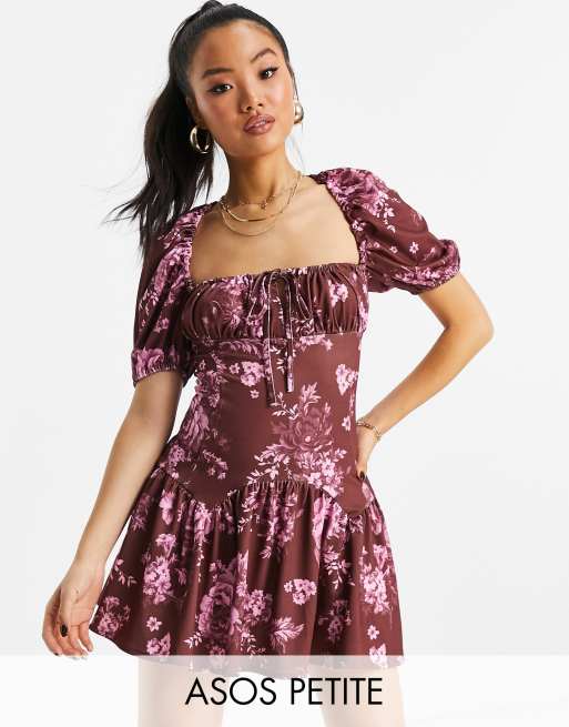 ASOS DESIGN Petite – Rosenmönstrad miniklänning med fyrkantig ringning och knytning baktill
