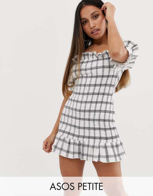 ASOS DESIGN Petite – Rutig off shoulder-solklänning med smock