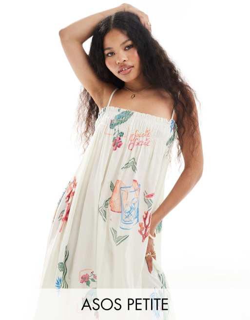 ASOS DESIGN Petite – Strandklänning i trapetsmodell med vykortsmönster