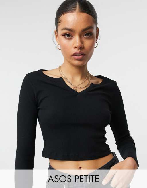 ASOS DESIGN Petite – Svart, kort topp med lång ärm, v-sprund och smal passform