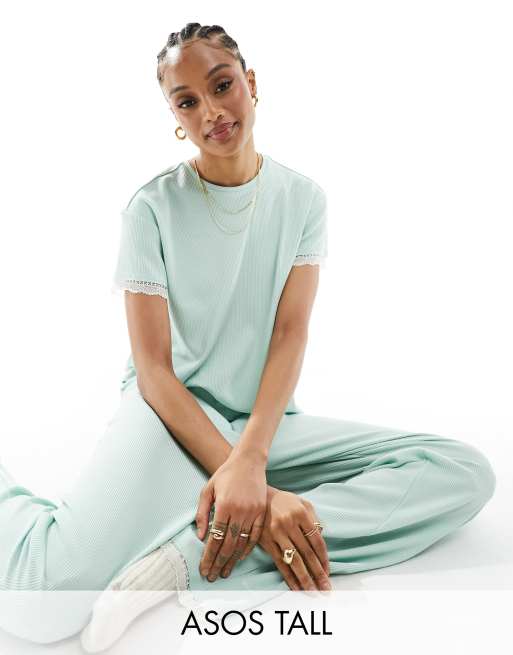 ASOS DESIGN Tall – Mixa & matcha – Gröna våfflade pyjamasbyxor med spets