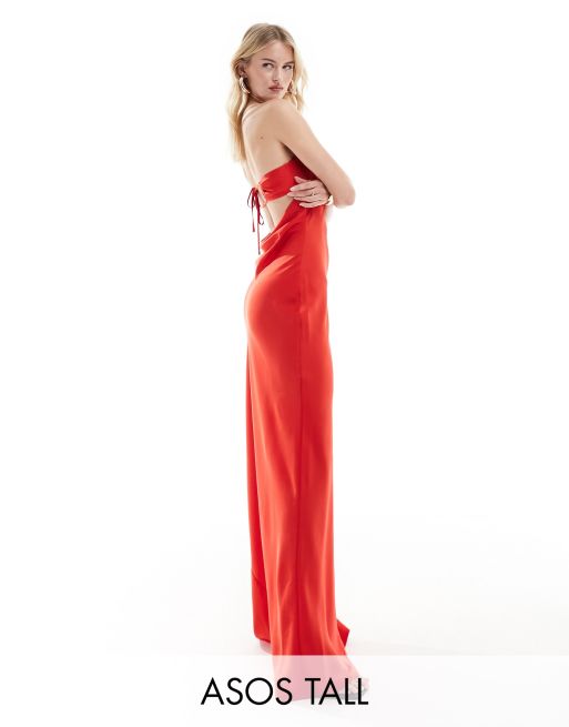 ASOS DESIGN Tall – Röd diagonalskuren maxiklänning i satin med bandeauringning och knytning baktill