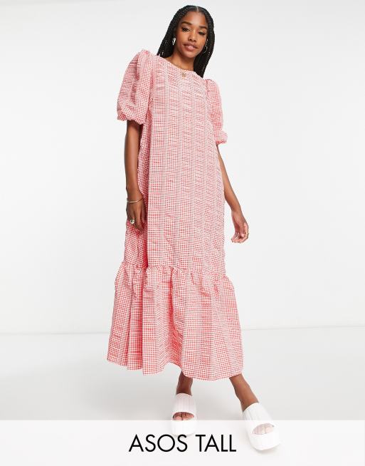 ASOS DESIGN Tall – Röd smockad maxiklänning med volymärm och ginghamsrutig mix