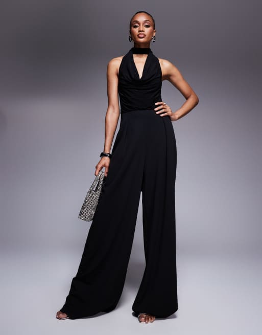ASOS DESIGN Tall – Svart jumpsuit i blandat material med vida ben, djup ringning och knytning vid halsen