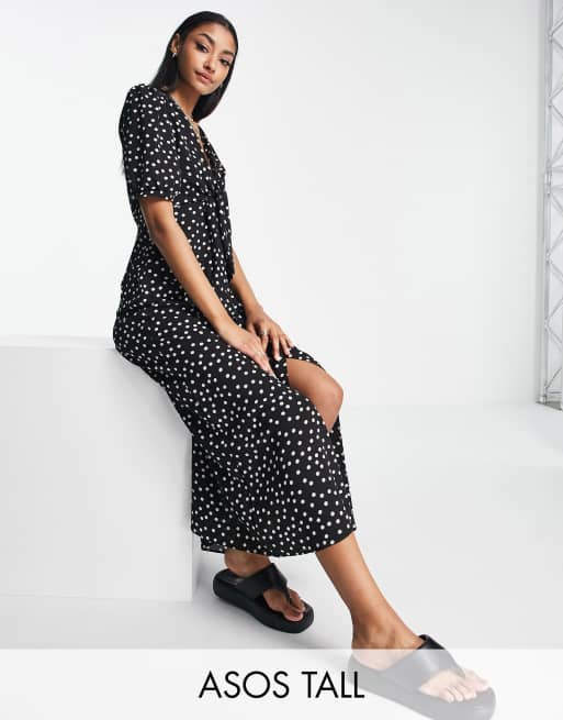 ASOS DESIGN Tall – Svartvit midiklänning med prickigt mönster, knäppning och knytning framtill
