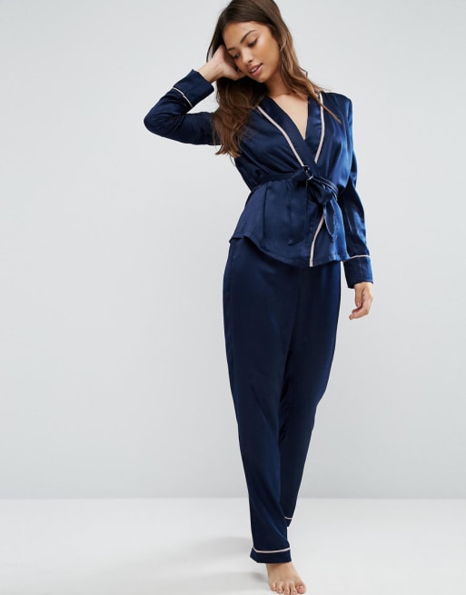 ASOS Premium – Set i satin med kimono och byxor med kantband
