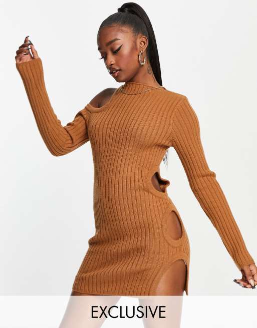 ASYOU – Chokladbrun stickad miniklänning med utskurna detaljer och lång ärm