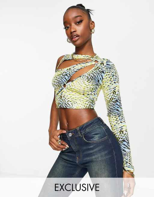 ASYOU – Gul mönstrad topp med en ärm och utskurna detaljer