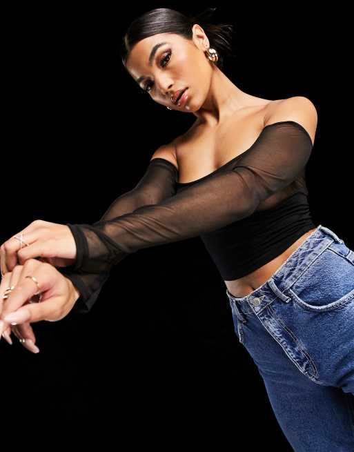 ASYOU – Svart beskuren topp med bardotringing i mesh