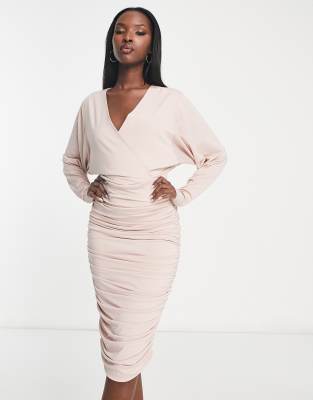 AX Paris – Ljusrosa, rynkad midiklänning med pingvinärmar