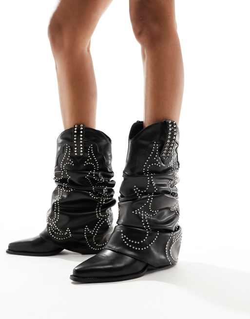 Azalea Wang - Rune - Svarta, vikbara westernkängor med nitar
