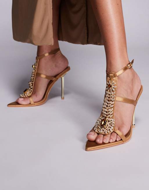 Azalea Wang – Wyatt – Bruna, högklackade sandaler med vävd utsmyckning