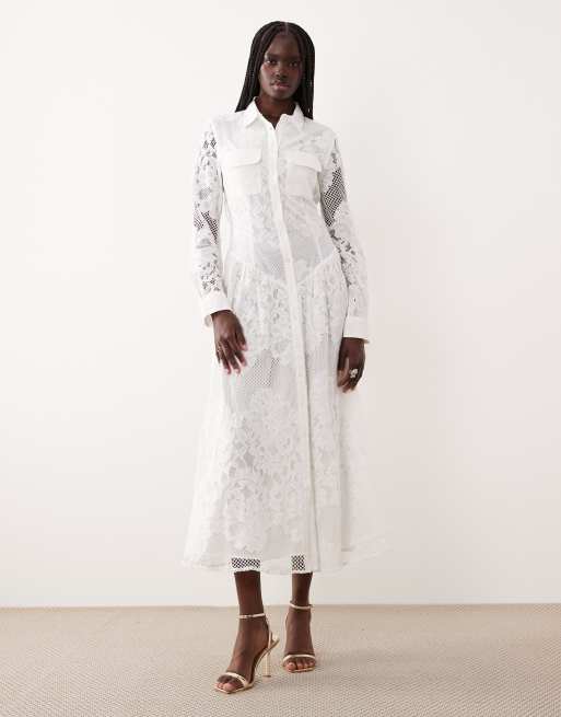 Bardot – Agatha – Elfenbensvit midaxiklänning i bomullsrikt tyg med spets