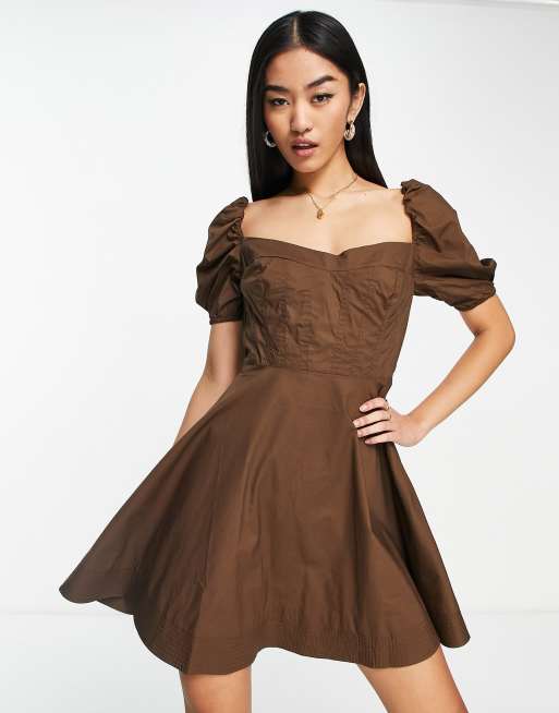 Bardot – Chokladbrun miniklänning med korsett-detalj och puffärmar