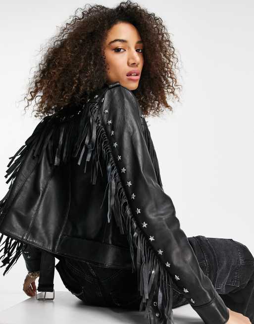 Barney's Originals – Skinnjacka med fransar av äkta läder