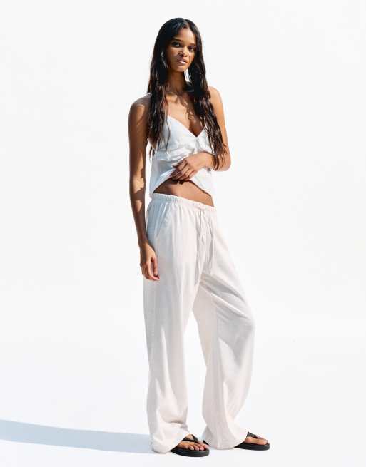 Bershka – Beige byxor i linnerikt tyg med elastisk midja