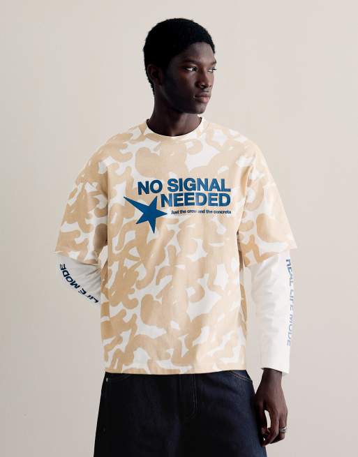 Bershka – Beige t-shirt med dubbla ärmar och tryck