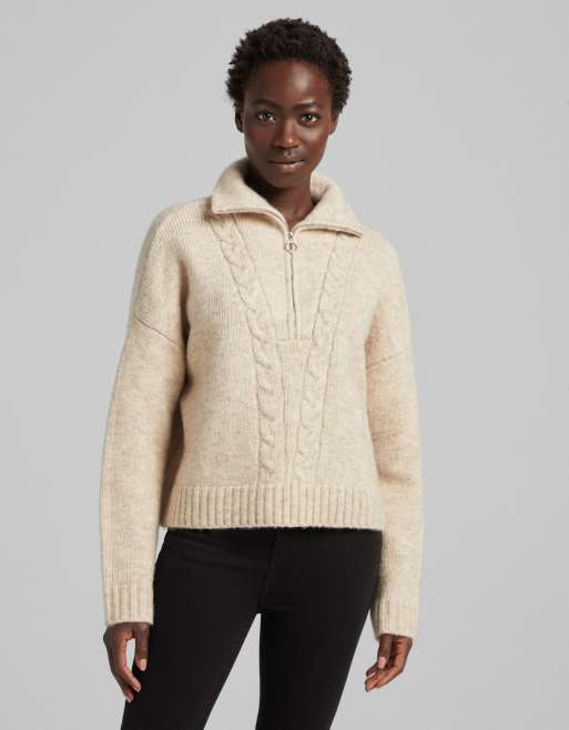 Bershka – Beige tröja med kabelstickad detalj och dragkedja i halsen