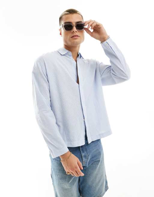 Bershka – Blå, rustik skjorta i linne med långa ärmar