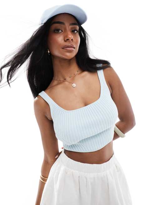 Bershka – Blekblå, ribbstickad topp med fyrkantig ringning
