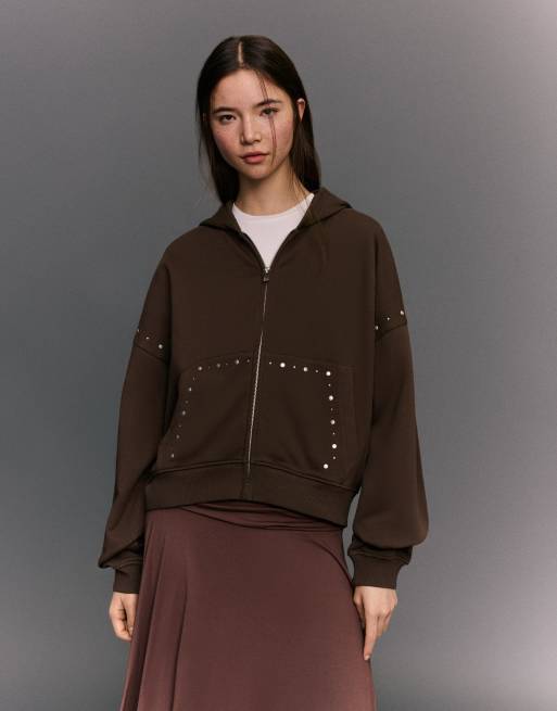 Bershka – Brun sweatshirt med dragkedja, huva och nitar
