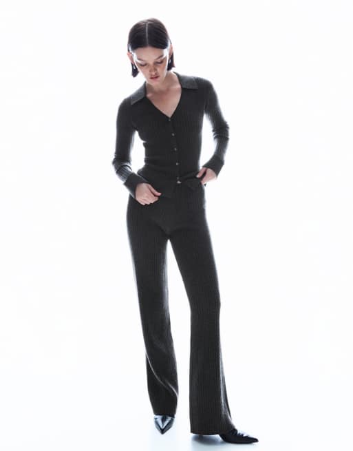 Bershka – Grå, ribbade byxor med vida ben