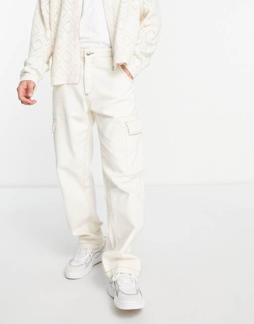 Bershka – Gräddvita, vida cargobyxor med kontrastfärgade remmar