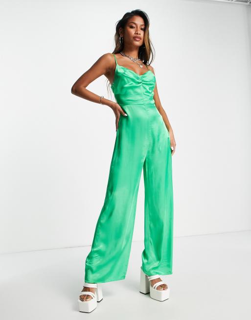 Bershka – Grön jumpsuit i satin med ryschade detaljer