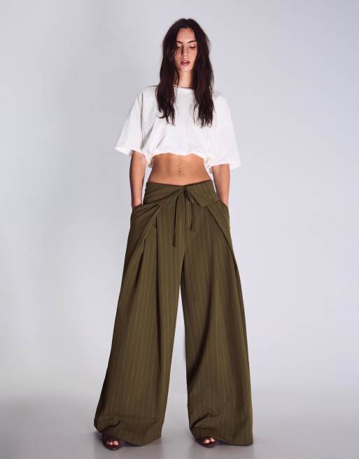 Bershka – Kakifärgade byxor med veck och nedvikt midja