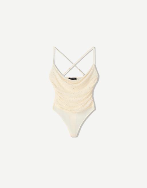 Bershka – Krämvit body med strass och axelband i mesh