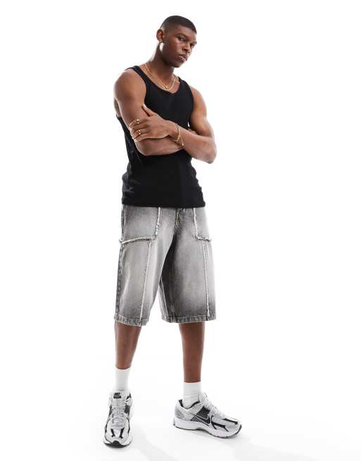 Bershka – Ljusgrå, baggy bermudashorts i denim med fransar