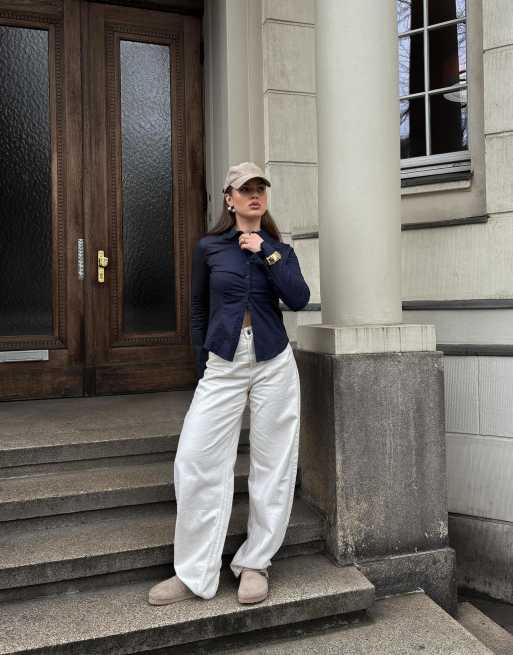 Bershka – Marinblå, figurnära skjorta med utsvängda ärmar