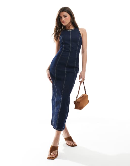 Bershka – Mörkblå, skulpterande maxiklänning i denim och bodycon-modell