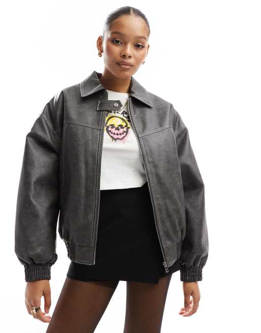 Bershka – Mörkgrå jacka i läderimitation med boxig passform