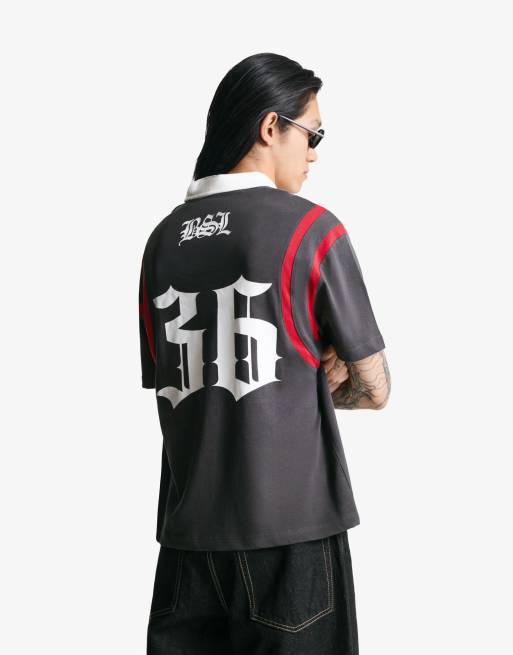 Bershka – Mörkgrå pikétröja med korta ärmar och mönster