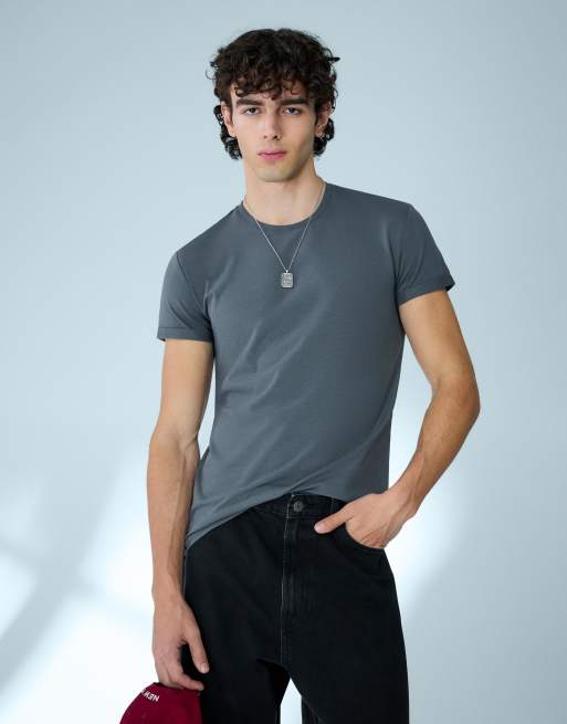 Bershka – Mörkgrå t-shirt med korta ärmar och uppvikt nederkant